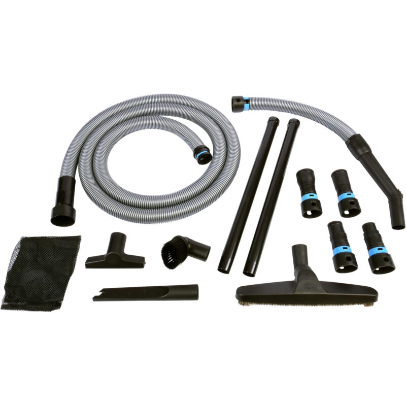 The kit is designed to provide the advantage of the Quick Click system to the need for general work shop clean-up of floor surfaces, power tools and work stations, and includes the Quick Click four piece adaptor set for the collection of dust and debris generate by the use of power tools.