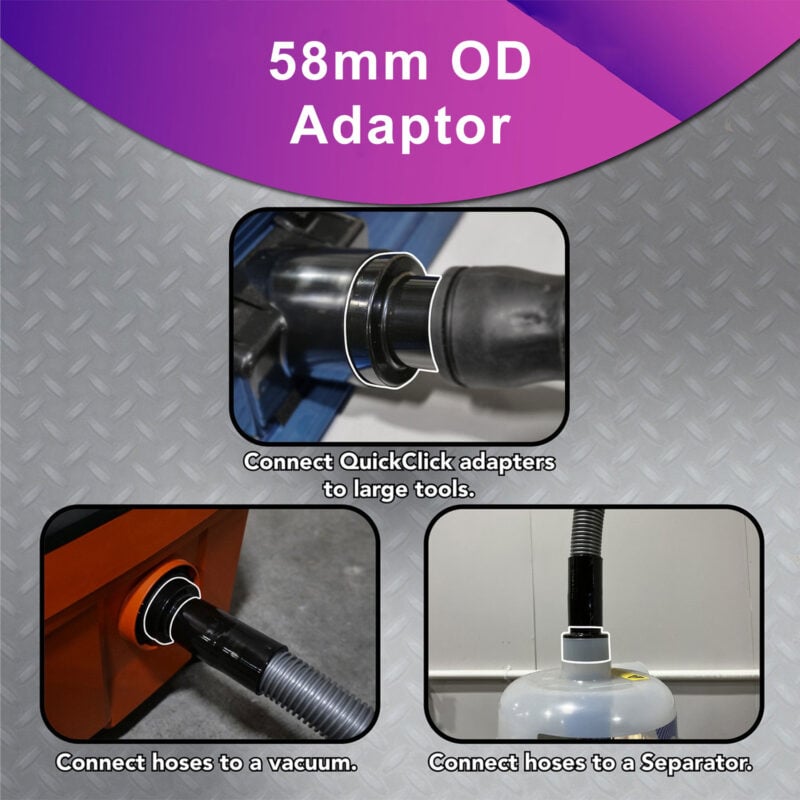 Standard home shop vacuum hose with power tool adaptor set is engineered to connect a wide range of major power tool brands to your home shop vacuum for recovery of the debris and dust generated during the use of the power tool, keeping you and your shop clean while protecting you from airborne particulate that can harm your health. The adaptors are designed to be versatile with most unique and tool industry typical connections. The inner collar with durable acetyl clip connects directly to most brands of dry wall sanders and other tools generating high volumes of dust or having large debris profiles. A bayonet fitting with 25mm (1″) soft TPE moulded fitting is perfect for small power tool connections. The smooth 360 degree swivel rotation of the bayonet prevents the hose from kinking or resisting free movement of the power tool. Changing from the 25mm fitting to a 38mm (1.5″) soft TPE fitting popular on many chop saws and routers takes only a second using the quick clip system. Further adaptors included in this expanded set are 19mm (0.75″) and 32mm (1.25″) fitting additional brands of tools and shrouds. Finally, an air relief is designed into the bayonet fitting to allow adjustment of the air stream at the tool as necessary to prevent tools sealing to the work surface. The final included adaptor is an additional 58mm (2.25″) standard wet/dry vacuum adaptor into the quick connect adaptor. This allows for a 58mm cuff throughout the system so as to work with dust collection workstations often utilised with table saws. The hose offers a 32mm diameter highly flexible commercial grade vacuum hose with smooth interior to prevent clogs and maximise air flow to the vacuum. The shop vacuum connection is designed to maximise the opening from the hose into the vacuum to prevent clogs and improve airflow delivering the maximum performance from your vacuum. This hose is designed to fit all major brands of power tools and work shrouds including Festool, Bosch, Ryobi, Makita, DeWalt, Mirka, Fein, Einhell, Evolution, Hitachi, Milwaukee Electric and many more. The tank end is designed to fit all major brands of home shop vacuums including Bosch, Festool, Makita, Nilfisk, Shop-Vac, Titan, Vacmaster, Mirka, DeWalt and Fein, as well as many private brands typical of the 58mm vacuum connection. This is a similar package to the popular 94192 system, but with an expanded adaptor set to fit even more brands and tools.